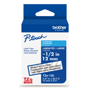 Cinta Brother TZE135G laminada texto blanco sobre fondo transparente 12mm x 8mts